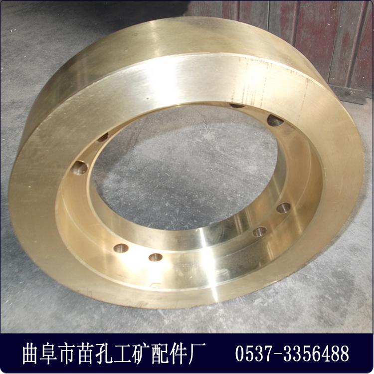 曲阜市苗孔工矿配件厂生产的铜垫主要应用于矿用天轮 绳轮 凿井天轮 立井天轮 游动天轮 固定天轮,其主要材质为H65,H65的主要特性为:性能介于H68和H62之间,价格比H68便宜,也有较高的强度和塑性,能良好地承受冷、热压力加工,有腐蚀破裂倾向。有良好的力学性能,热态下塑性好,冷态下塑性也可以,切削性好,易钎焊和焊接,耐蚀,但易产生腐蚀破裂。此外价格便宜,是应用广泛的一个普通黄铜套的材质。H62(即四六黄铜)。在室温下β相较α相硬得多,因而可用于承受较大载荷的零件。α+β两相黄铜可在600℃以上进行热加工。α+β两相黄铜显微组织:α为亮白色的固溶体,β是CuZn为基的有序固溶体。用途可做各种深拉深和弯折制造的受力零件,如销钉、铆钉、垫圈、螺母、导管、、气压表弹簧、筛网、散热器。